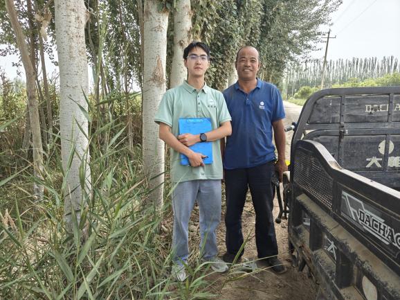 在现场会讲解之后,唐闻与昆玉市红枣科技小院学生一同走访农户,进行问卷调研,将团队的技术培训资料发放到农户手中,并在农药和肥料的使用上提供帮助,讲解施用的关键事项,发挥团队的专业优势,真正做到把成果带出学校,把论文写在大地上。
