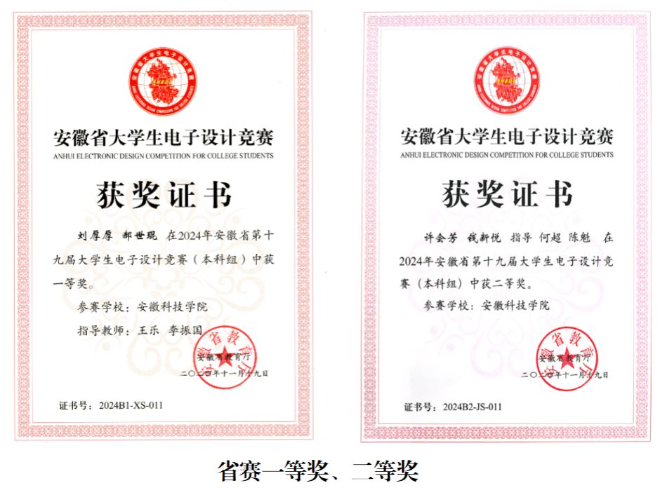 | 全国大学生电子设计竞赛 | 全国总决赛一等奖 | 郏景隆(光电23级)、王毅(电信22级)、刘子龙(电气24级) | 2025年 |