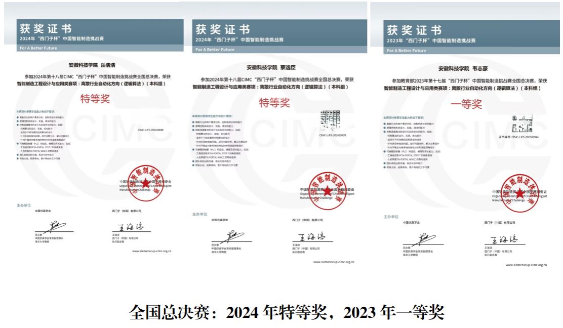 | “西门子”杯中国智能制造挑战赛 | 全国总决赛一等奖 | 韦志豪(电气20级)、张福发(建电21级)、崔瑞玉(建电21级) | 2023年 |