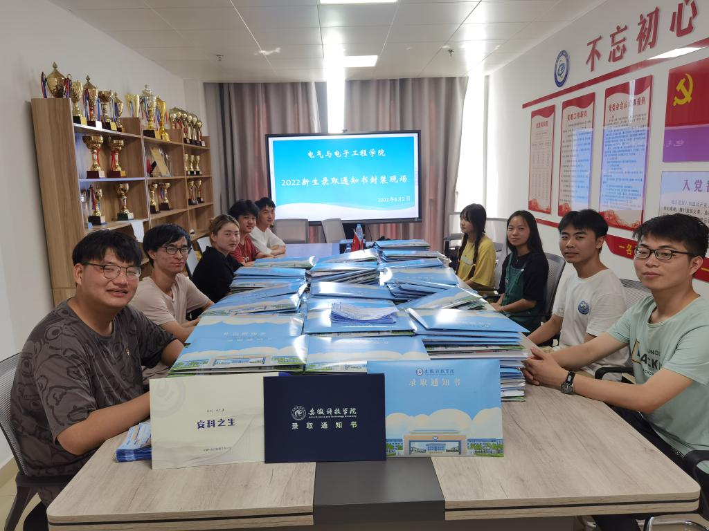 8月1日、8月8日,辅导员陈更强、洪乃羽、学生干部及暑期留校学生代表陆续开展安徽省内431名新生、安徽省外19名新生及50名联培专升本新生的录取通知书装袋、邮寄工作,进一步保障学生及时收到录取通知书,成为“安科之生”,投入电气与电子工程学院大家庭。与此同时,辅导员于宏亮组织导生团在新生群为学院新生开展各类答疑工作,帮助新生了解大学校园学习、生活相关内容。