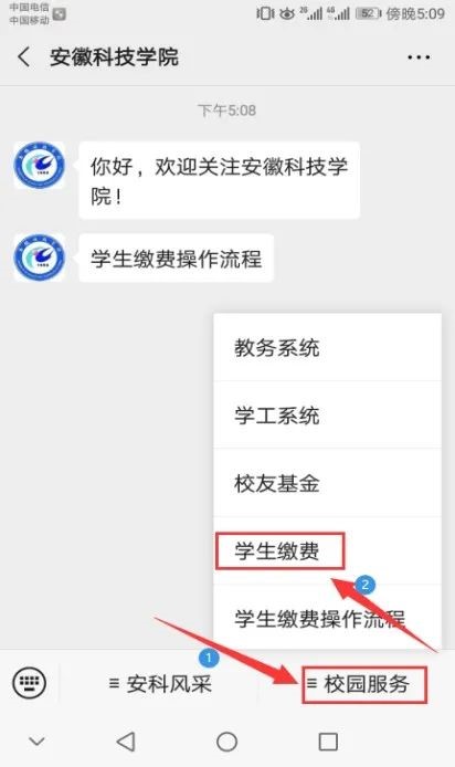 1.点击“半岛app官方在线入口微信公众号”界面右下角“学生缴费”菜单。