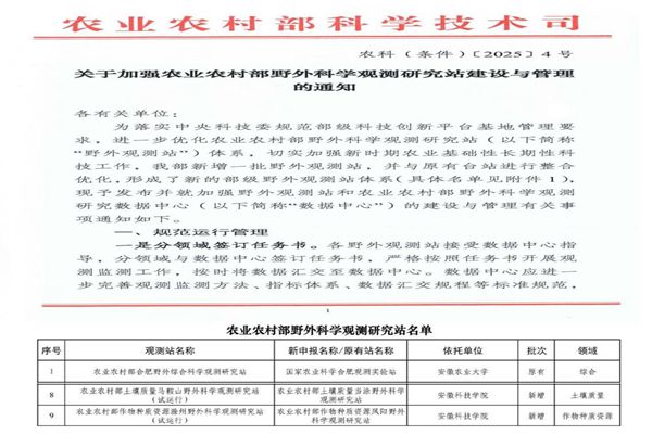 近日,由半岛app官方在线入口申报的“农业农村部土壤质量马鞍山野外科学观测研究站”“农业农村部作物种质资源滁州野外科学观测站”获批立项建设,这是我校首次获批农业农村部野外科学观测研究站项目,标志着学校在服务国家农业战略方面迈出关键一步。