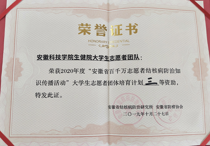 生命与健康科学学院青年志愿者团体组建于2019年,是滁州市第二个大学生志愿团体。该团体自成立以来,结合疫情防控,组织开展了形式多样、内容丰富的结核病防治宣传活动,提高了学校师生和凤阳县及当地市民对结核病防治工作的认识,营造了全社会共同关注结核病防治的良好氛围,2020年,该团体荣获2020年度省“百千万志愿者结核病防治知识传播活动”大学生志愿者团体培育计划三等资助,这是该团体第二次获此立项资助。