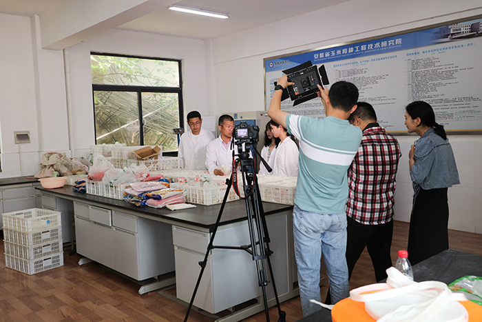 记者采访我校玉米专家余海兵教授,介绍玉米科研新型品种选育及推广和种植的经济效益