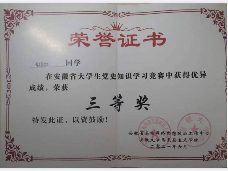 为庆祝中国共产党成立100周年,认真学习贯彻习近平总书记在党史学习教育动员大会上的重要讲话精神,汲取党史营养和力量,按照学史明理、学史增信、学史崇德、学史力行,引导广大学生党员增强“四个意识”、坚定“四个自信”、做到“两个维护”,引导全体大学生传承红色基因、坚定理想信念。安徽省高校网络思想政治工作中心、安徽大学马克思主义学院开展全省大学生党史知识学习竞赛的决赛于2021年6月27日在合肥丰大国际大酒店举行。我校财经学院财务管理193班李绍红同学入围现场决赛,马克思主义学院戴婧佼老师作为指导教师,带队参加比赛。