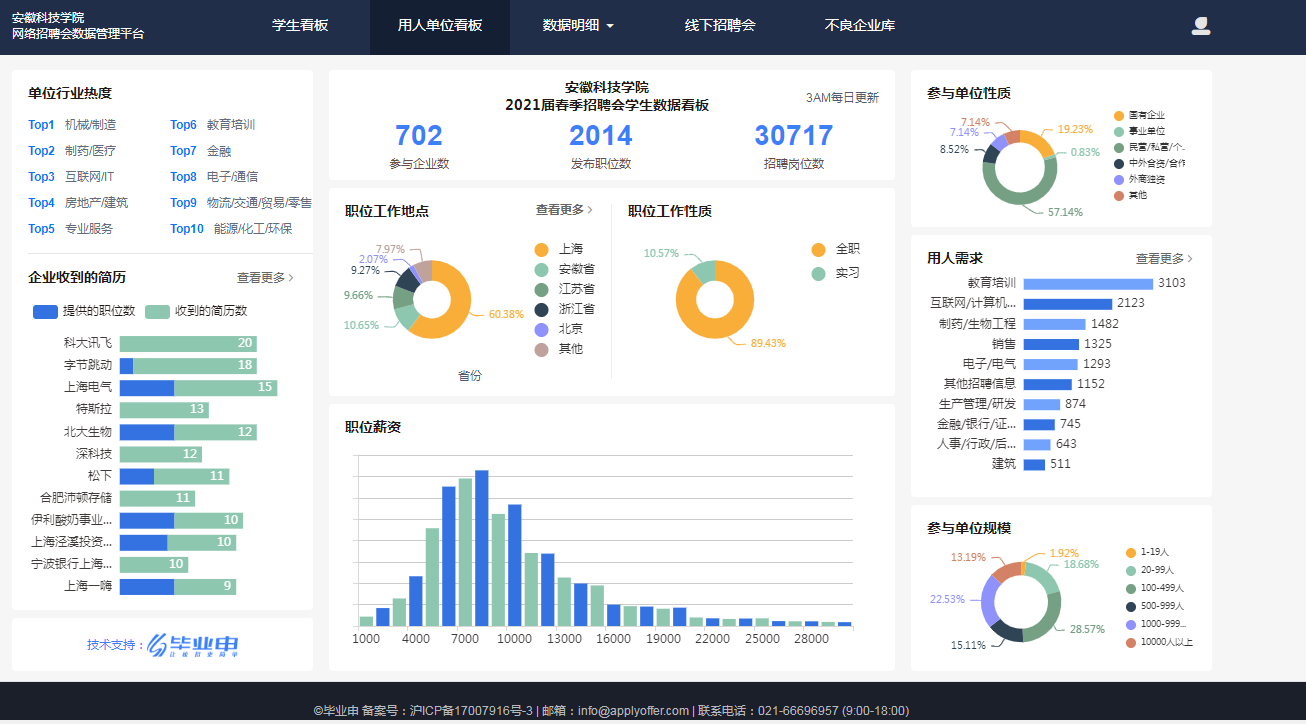 根据2018-2020三个年度毕业生就业质量报告,我校毕业生省外就业主要面向长三角核心地区,其中,在沪就业比例一直在10%以上。毕业生去向就是就业工作取向,学校加强长三角区域就业布局,作为毕业生就业工作的重点布局领域。2020年下半年疫情缓解以来,学校积极与上海学生事务中心联络,继续拓展合作领域,截至2021届毕业生离校时,先后举办“多方联动、聚力就业”上海市2021届高校毕业生春季“安科之生”专场招聘会、“安科之生”春季就业冲刺月(互联网专场)、高校毕业生就业促进周2021年“安科之生”专场、毕业季“安科之生”专场、长三角招聘会半岛app官方在线入口“海聚英才”2021年离校未就业毕业生专场云聘会、长三角“安科之生”2021届毕业生离校未就业专场,6个场次共有36345次访问记录,投递简历2033份,702家用人单位共发布5007个职位,73865个岗位,涉及机械制造、制药医疗、互联网等诸多行业领域,涵盖了数字经济、电子信息、新材料等重点发展产业,为毕业生融入长三角区域就业提供了广阔的双选平台。(特约通讯员:司萍 审核:施培智 编辑:张威)
