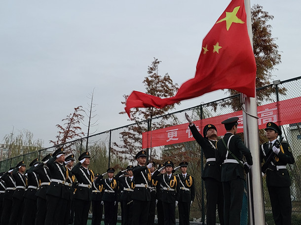 6时40分,国旗护卫队队员们着装整齐,迈着矫健的步伐,护卫着国旗正步行进到旗杆下,随着升旗手振臂一挥,伴着庄严的《义勇军进行曲》的响起,鲜艳的五星红旗冉冉升起,同学们的目光聚焦冉冉升起的国旗,脸上透露着真挚、浓烈的爱国之情。