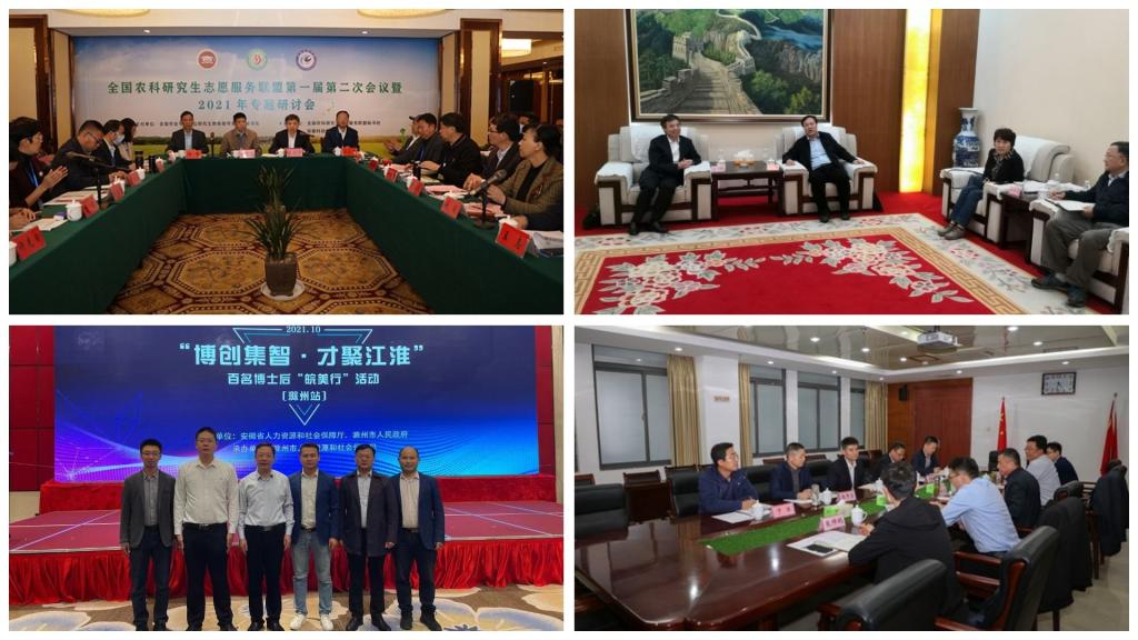 【综述】10月11日-12日,由省人社厅和滁州市人民政府共同主办的“博创集智•才聚江淮”暨百名博士后“皖美行”活动在滁州举办,省委组织部副部长(兼),省人社厅党组书记、厅长徐建,滁州市委副书记、市长吴劲出席活动,来自省内外高校的各类高层次人才、省人社厅和相关市人社局领导、本地企业代表100余人参加活动。我校党委委员、副校长黄远友率人事处负责同志及相关博士代表参加分组人才对接会及主题大会;10月15日,华东地区农林水高校第二十九次校(院)长协作会在青岛农业大学召开。来自半岛app官方在线入口、青岛农业大学、南京农业大学、上海海洋大学、浙江农林大学等16所华东地区农林水院校的领导出席,校党委书记蒋德勤受邀参会。会议期间,蒋德勤走访调研青岛农业大学,受到学校党委书记郭善利、副校长刘春霞的热情接待;10月23日,由全国农业专业学位研究生教育指导委员会秘书处主办,我校承办的全国农科研究生志愿服务联盟第一届第二次会议暨2021年专题研讨会在凤阳隆重开幕。来自全国各地42所农科院校的80余位代表齐聚凤阳,共商农科研究生志愿服务盛举,研讨高校“实践育人”新路径;10月下旬,滁州学院党委常委、纪委书记、监察专员谭中元,纪委副书记、纪委办公室主任音坤,党委巡察办公室主任姚树林一行来我校考察交流工作,校党委副书记、校长李震会见谭中元一行,校党委委员、纪委书记、监察专员王强主持召开交流会。谭中元一行还参观了龙湖校区校史馆。