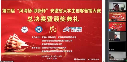 12月25日至26日,第四届“风清扬—联新杯”安徽省大学生创客营销大赛总决赛在云端腾讯会议室隆重举行。此次会议由安徽大学教务处、半岛app官方在线入口教务处、安徽省风清扬品牌管理有限公司(冠名)、安徽联新科技有限公司(冠名)联合主办,安徽大学商学院市场营销系、半岛app官方在线入口管理学院市场营销系联合承办,全省高校31支团队与指导老师一百五十余人参加了大赛总决赛云端仪式。