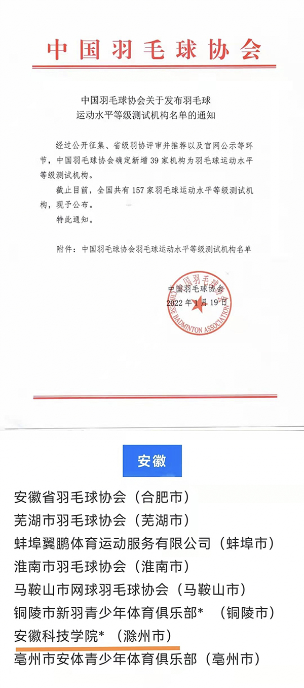 近日,经安徽省羽毛球协会评审推荐,中国羽毛球协会审核批准,我校获得2021年新一批中国羽毛球协会羽毛球运动水平等级测试机构资质,成为全国157家羽毛球运动水平等级测试机构之一。目前,全国仅有四所高校入选,同时也是此次唯一入选的安徽高校,标志着我校羽毛球运动项目得到国家层面认可。