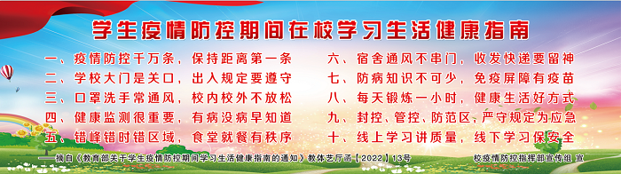 为深入贯彻习近平总书记关于新冠肺炎疫情重要指示批示精神,落实党中央、国务院决策部署,从严从实做好教育系统疫情防控工作,确保新冠肺炎疫情防控期间学生健康、校园安全和教学秩序,近日,教育部印发了《学生疫情防控期间在校学习生活健康指南》《学生疫情防控期间居家防护学习生活健康指南》《学生疫情防控期间集中隔离医学观察学习生活健康指南》《学生疫情防控期间住院就医学习生活健康指南》,分类精准指导学生在校、居家防护、集中隔离医学观察、住院就医期间安全学习、健康生活。