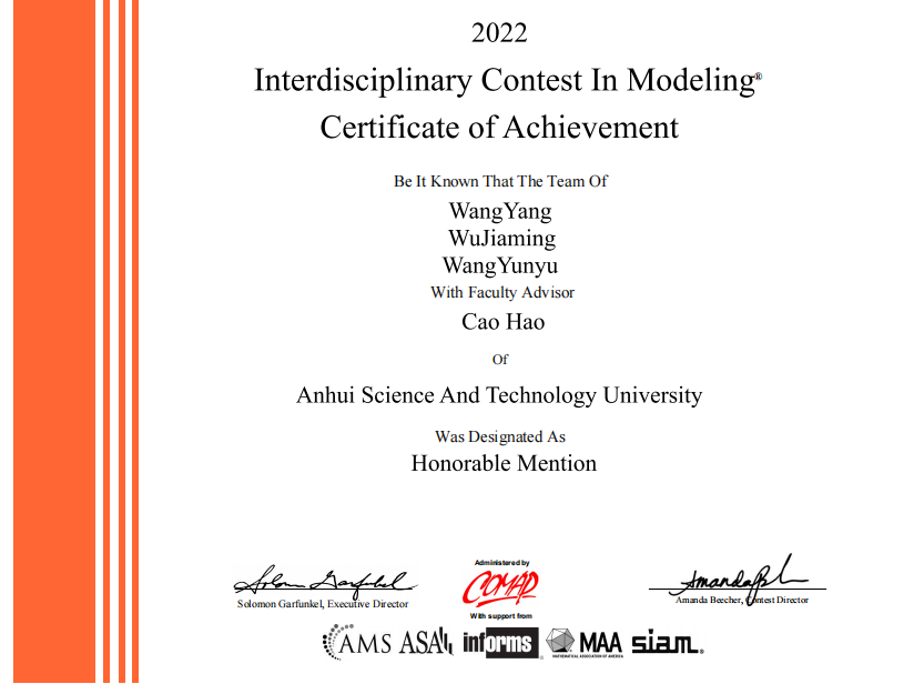 近日,2022年度美国大学生数学建模竞赛获奖结果公布,由信息与网络工程学院数据科学与大数据技术专业2019级汪洋、吴佳明、汪蕴钰等3位同学组成的团队(指导老师:曹浩)在全球近3万支参赛队伍中脱颖而出,荣获赛事的Honorable Mention(国际二等奖),这是我校队伍继2015年首次获得Honorable Mention后再次荣获赛事的国际二等奖。