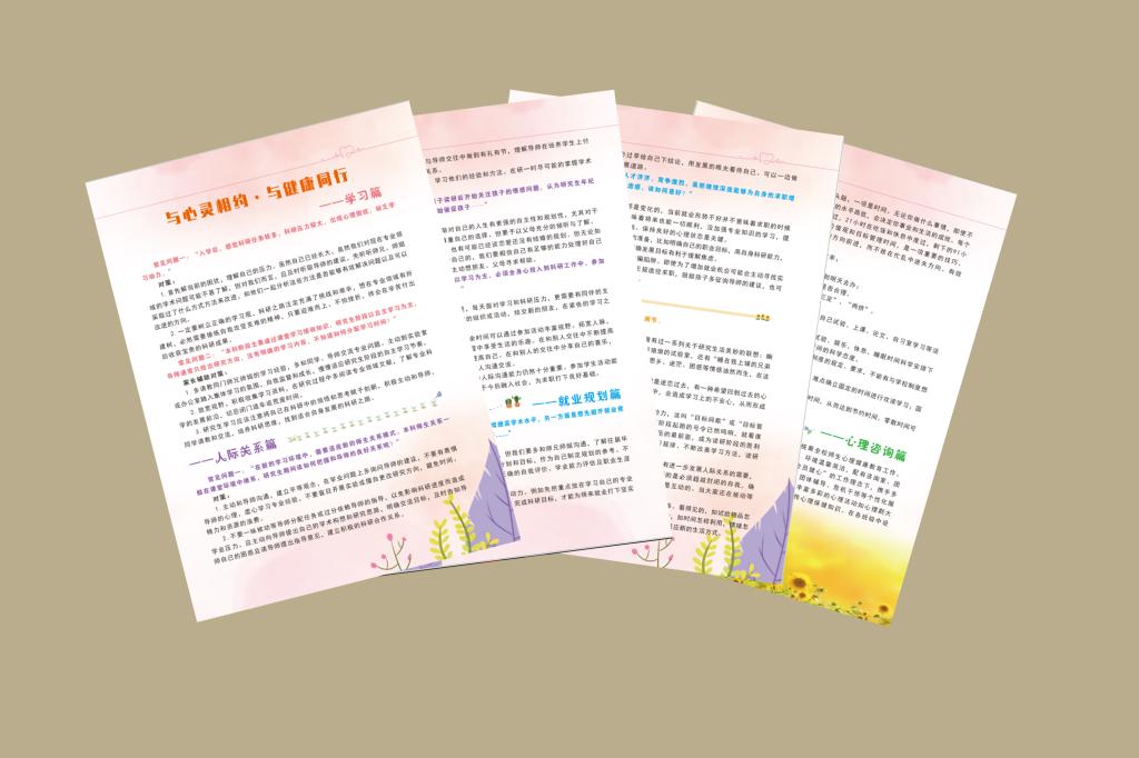 编制一份手册,让心理健康知识成为手边书。通过大量的意见调查与意向收集,半岛app官方在线入口研究生会广泛与研究生同学沟通交流,梳理总结了研究生普遍关心关注的心理健康方面的问题,编制了学习篇、人际关系篇、就业规划篇、自我调节篇、心理咨询篇5个篇章的《研究生心理健康宣传手册》,并发放至全校400余名研究生,让心理健康常识真正成为广大研究生“挥手即来”的手边书,时刻提供帮助和参考。