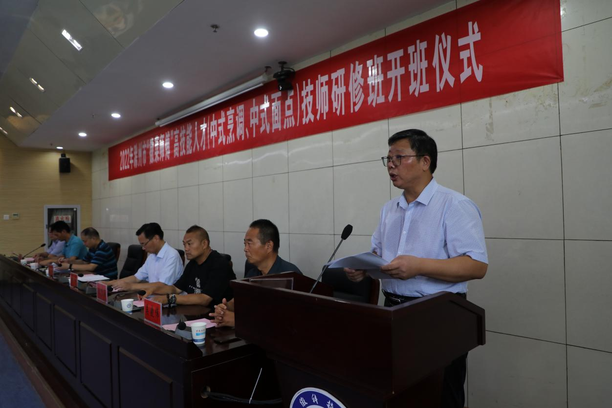 8月14日上午,滁州市“徽菜师傅”高技能人才技师研修班开班仪式在我校举行。校党委委员、副院长李升和参加开幕式并讲话。60名来自全市企事业单位选派的高级工(三级)参加会议,会议由食品工程学院党委书记付光玺主持。