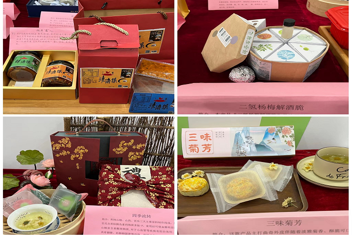 大赛现场,精彩纷呈。产品展示区域,山药茶膏系列糕点、“好享梨”水晶翠梨片、独具“酱”心、“撒椒卖辣”香脆椒、“青舫玉饮”西瓜皮酸奶、智芝饼等特色创新产品一一整齐陈列,赏心赏目,让人叹为观止。前来参观和品尝的同学都赞不绝口:“这造型太精美了!”“西瓜皮也能利用制作成营养美食,真没想到!”“你看,这菊花酥在烤制的时候像菊花一样缓缓绽放”“‘二氢杨梅解酒脆’巧克力还有解酒保肝功效呢”“各类产品真的是异彩纷呈,让人大开眼界!”比赛现场,每个团队都在紧张而有序地展开汇报,各团队负责人分别从研发缘由、研发过程、产品创新点、优势及市场前景等几个方面对产品进行了丰富细致的介绍,并现场回答了评委提出的各类问题。经过紧张激烈的角逐,“青舫玉饮”等四个团队斩获一等奖,“二氢杨梅醒酒脆”等九个团队获得二等奖,“四季予你”等十三个团队获得三等奖。