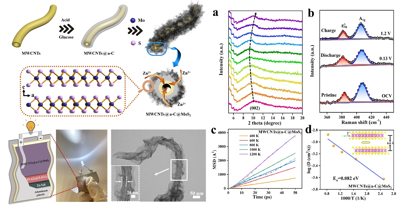 水系锌离子电池(AZIB)因其环保、安全、成本低廉等优点,被认为是一种极具前途的大规模储能装置。但二价Zn2+在电极材料中缓慢的扩散动力学和活性材料差的利用率,严重阻碍了AZIB的实际应用。本文设计了无定形碳层修饰的多壁碳纳米管与二硫化钼复合的“三明治”结构(MWCNTs@a-C@MoS2)作为AZIB的正极。受益于无定形碳松散表面上的大量含氧基团,MoS2可以在多壁碳管上均匀成核生长,避免MoS2的团聚,提高活性材料的利用率,从而获得优异的电化学性能。该工作通过恒电流间歇滴定(GITT)、分子动力学(MD)模拟、离位表征对电化学反应动力学和储能机理进行了深入研究,表明其具有理想的赝电容行为和低的离子扩散能垒。此外,该工作也成功组装了柔性准固态AZIB,在极端弯曲条件下也表现优异,证明了其实用性。该研究成果对于水系电极材料的设计、应用具有重要的借鉴和指导意义。(特约通讯员:沈竞成 审核:张炎 编辑:张威)