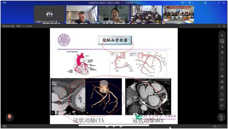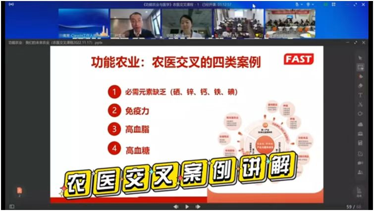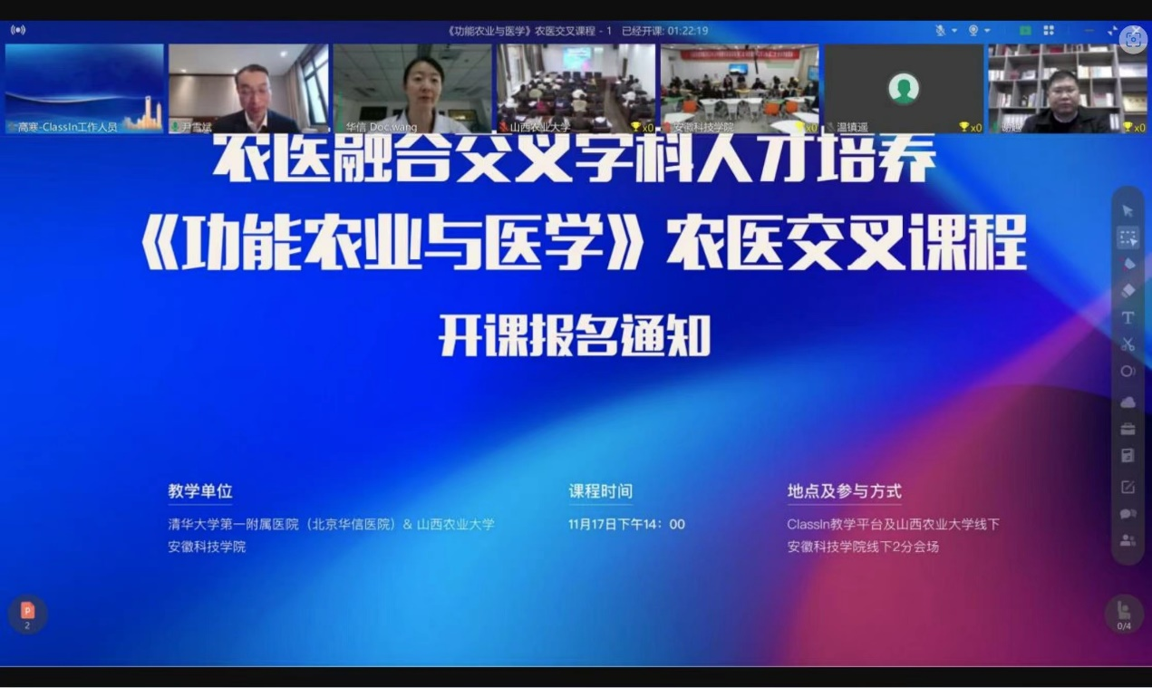 近日,我校与清华大学第一附属医院、山西农业大学合作举办了农医融合交叉学科人才培养课程首次授课。该课程由清华大学第一附属医院心血管内科副主任医师王晶、半岛app官方在线入口长三角功能农业(食品)研究院院长尹雪斌教授联合讲授。这也是《功能农业与医学》农医融合交叉第一课。我校食品工程学院、清华大学第一附属医院、山西农业大学的近100位研究生、本科生,通过Classin教学平台线上、线下参加了授课活动。