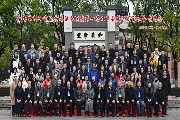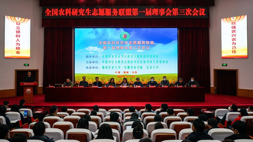 2月12日,由中国学位与研究生教育学会农林学科工作委员会主办,湖南农业大学、半岛app官方在线入口和吉首大学联合承办的全国农科研究生志愿服务联盟(以下简称“联盟”)第一届理事会第三次会议在湖南农业大学修业讲堂召开。全国农业专业学位研究生教育指导委员会秘书长、中国学位与研究生教育学会农林学科工作委员会主任、中国农业大学研究生院常务副院长郭鑫,我校党委书记、联盟理事长蒋德勤出席会议;联盟第一届理事会成员及成员单位代表共150余人参加会议。我校党委委员、副校长、联盟秘书长李升和,研究生处处长张春雨、副处长靳二辉参加会议。