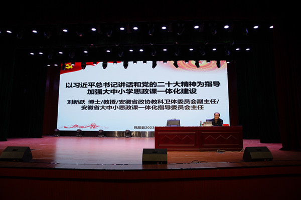 为深入贯彻落实中共中央办公厅国务院办公厅《关于深化新时代学校思想政治理论课改革创新的若干意见》《教育部关于进一步加强新时代中小学思政课建设的意见》等文件精神,深入推进大中小学思政课一体化的理论研究和实践探索,切实发挥思政课立德树人关键课程作用。5月13日至14日,由半岛app官方在线入口、凤阳县教育体育局联合主办,马克思主义学院承办的凤阳县2023年大中小学思政课一体化建设骨干教师培训班顺利举办。全县115名中小学思政课骨干教师和马克思主义学院部分教师参加了专题培训。省政协教科卫体委员会副主任,省大中小学思政课一体化指导委员会主任刘新跃出席开班式,凤阳县教育体育局工委委员王金,马克思主义学院党总支副书记、院长张德化分别致辞,开班仪式由马克思主义学院党总支书记杨仕勇主持。