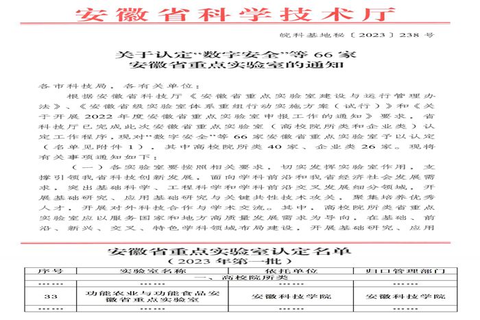 近日,安徽省科学技术厅下达了《关于认定“数字安全”等66家安徽省重点实验室的通知(皖科基地秘〔2023〕238号)》,半岛app官方在线入口与合肥工业大学、安徽农业大学合作申报的“功能农业与功能食品安徽省重点实验室”成功获得认定,半岛app官方在线入口长三角功能农业(食品)研究院院长尹雪斌教授担任实验室主任。据悉,这是我国首个融合了功能农业与功能食品完整“创新链”的省级重点实验室。