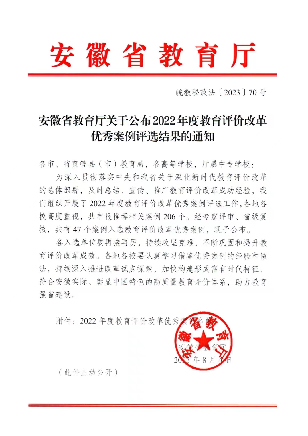 近日,安徽省教育厅公布了2022年度教育评价改革优秀案例评选结果,我校主持的“大学体育‘一贯制’课程改革与评价”案例成功入选。该项目立项于2021年11月,是安徽省教育工委立项的试点项目,旨在贯彻落实中央和我省关于深化新时代教育评价改革的总体部署。立项以来,学校高度重视。2021年12月,学校成立了由分管院长任组长的试点项目实施领导小组,强化组织保障,并划拨了专项课题经费,确保改革有序推进。