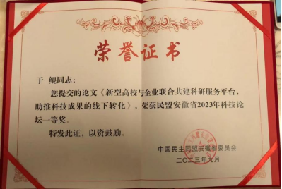 9月16日,由民盟安徽省委举办的民盟安徽省2023年科技论坛在蚌埠市成功举办。民盟半岛app官方在线入口总支盟员、民盟蚌埠市科技委员会副主任于鲲撰写的论文《新型高校与企业联合共建科研服务平台,助推科技成果的线下转化》荣获优秀论文一等奖。