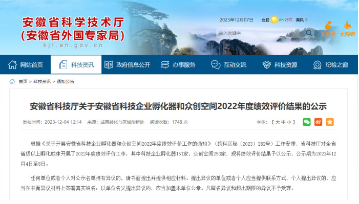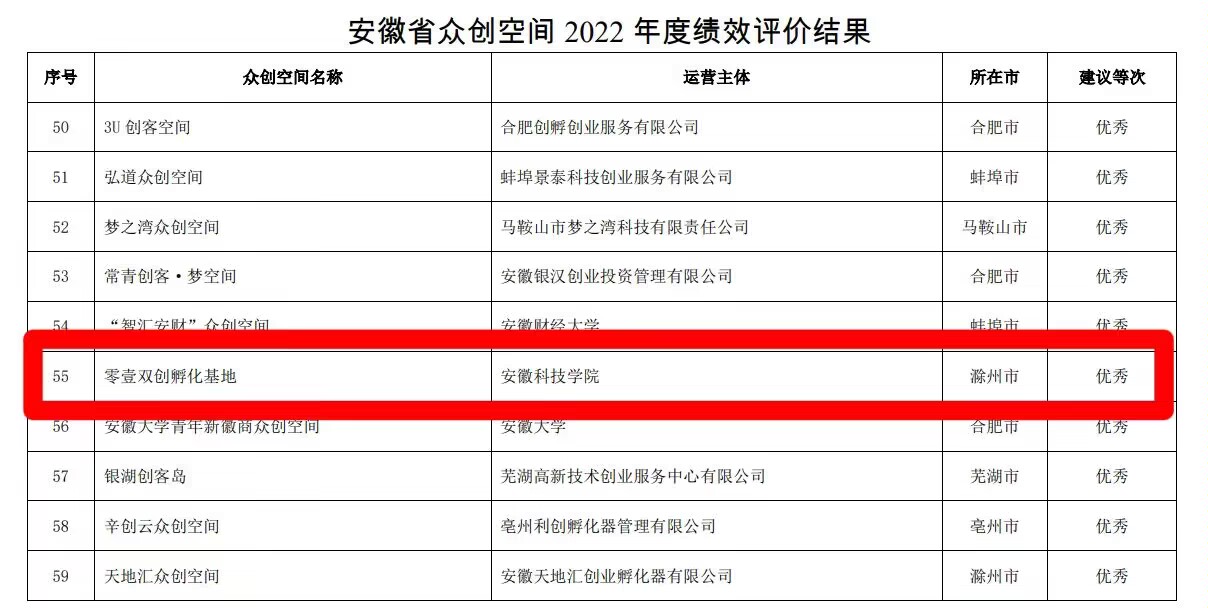 12月4日,安徽省科学技术厅发布《安徽省科技企业孵化器和众创空间2022年度绩效评价》结果,我校运营的省级众创空间“零壹双创孵化基地”获优秀等次。