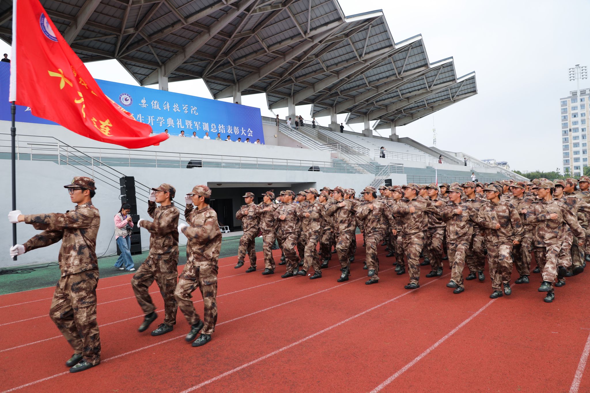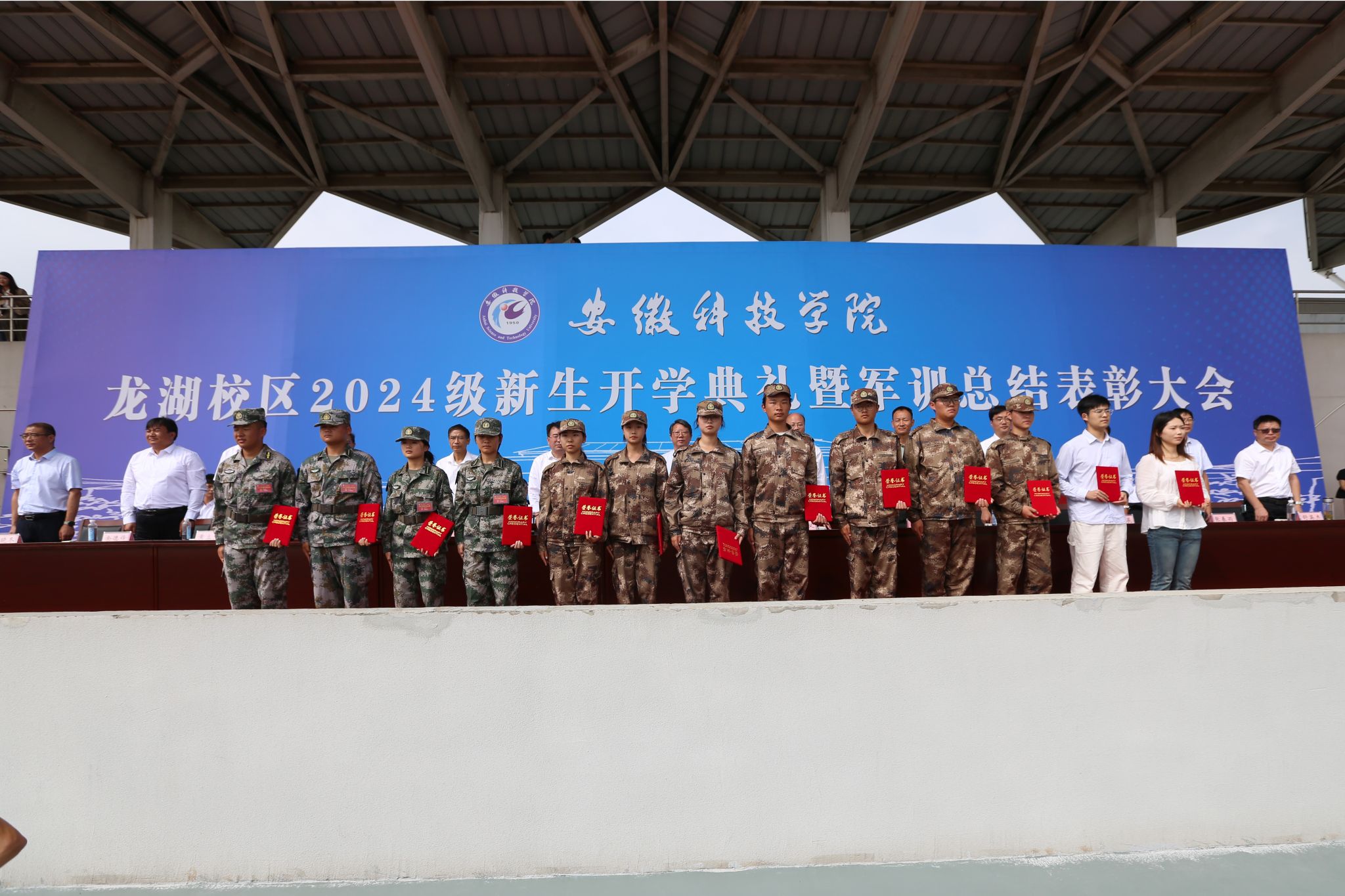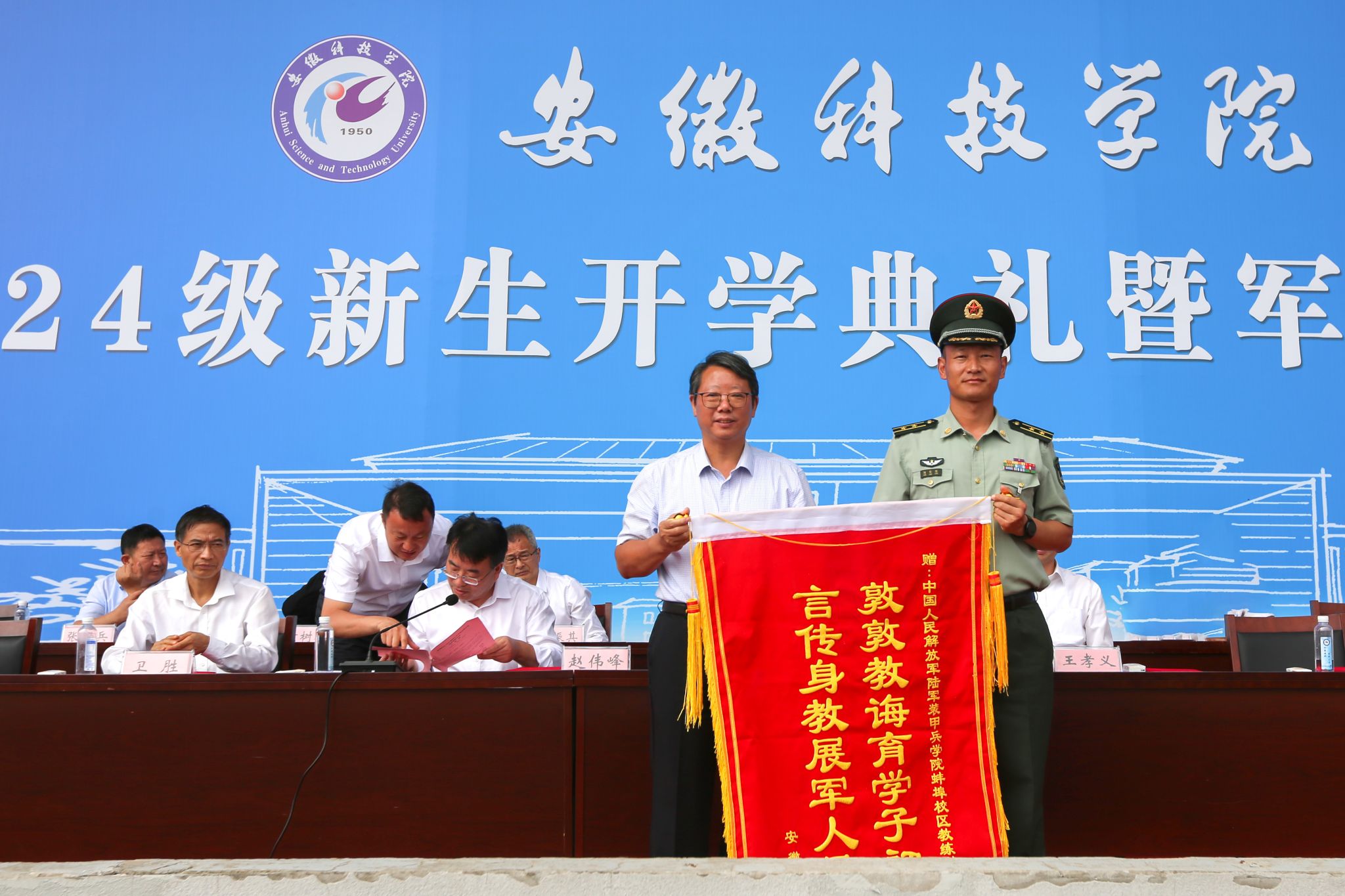 9月29日上午,我校龙湖校区2024级新生开学典礼暨军训总结表彰大会在南田径场举行。校党委委员、副院长李升和,党委委员、副院长王孝义,党委委员、副院长赵伟峰,陆军装甲兵学院蚌埠校区中校、龙湖校区军训团团长杨陈陈出席大会并在主席台就座。大会由赵伟峰主持。