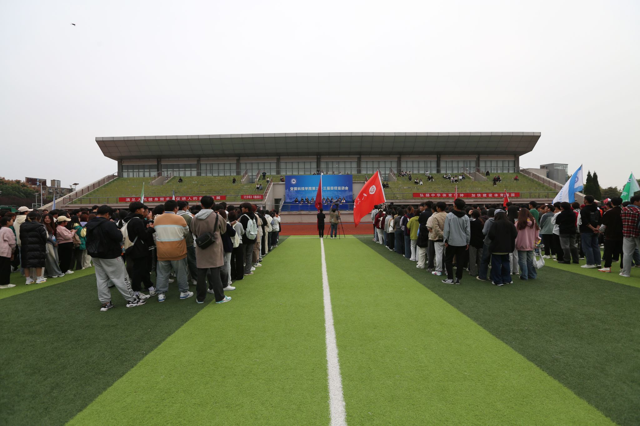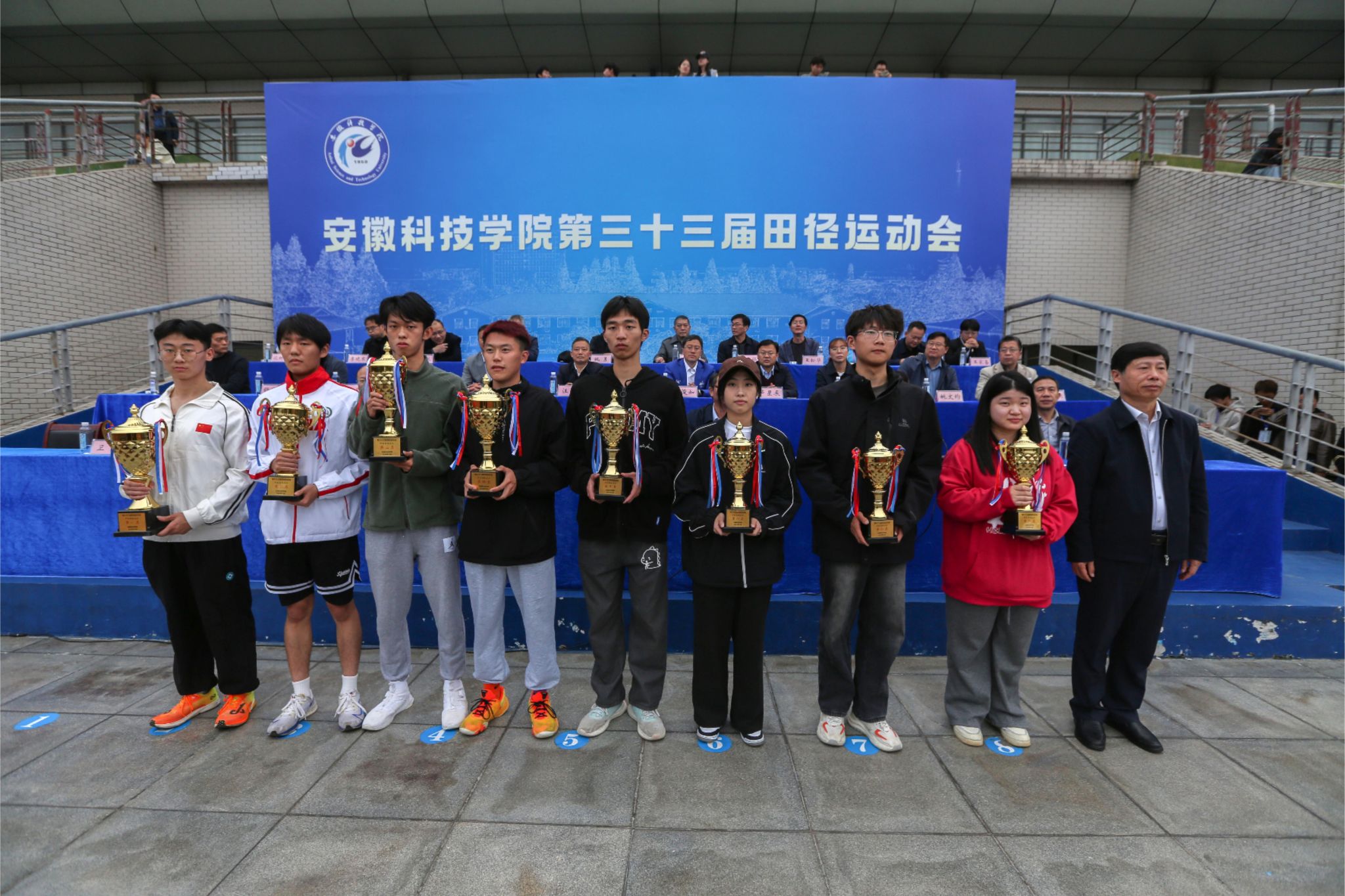 经过两天紧张激烈有序的比赛,10月26日下午,我校第三十三届田径运动会圆满完成各项预定赛程在凤阳校区西区运动场闭幕。党委书记时伟,党委副书记、院长李升和,党委委员、副院长王孝义,党委委员、副院长赵伟峰,党委委员、机关党委书记卫胜,党委委员、党委宣传(统战)部部长何永勇出席闭幕式并为获奖单位颁奖。校体育运动委员会委员、全体裁判员、运动员和各学院师生代表参加闭幕式。闭幕式由赵伟峰主持。