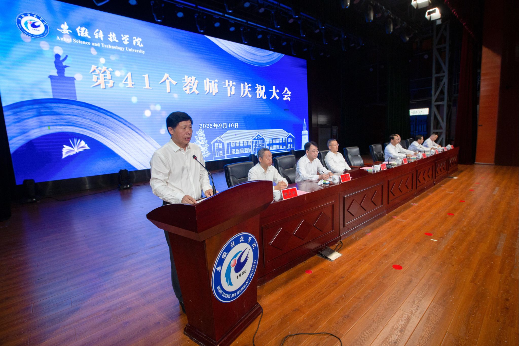9月10日下午,学校在凤阳校区大学生活动中心召开2025年教师节庆祝大会,党委书记时伟,党委副书记、院长李升和,党委副书记曹付忠,党委委员、副院长王孝义,党委委员、副院长赵伟峰,党委委员、副院长王玉和、党委委员、纪委书记、监察专员彭庆刚、党委委员、副院长方鸣出席大会并在主席台就座。会议由李升和主持。