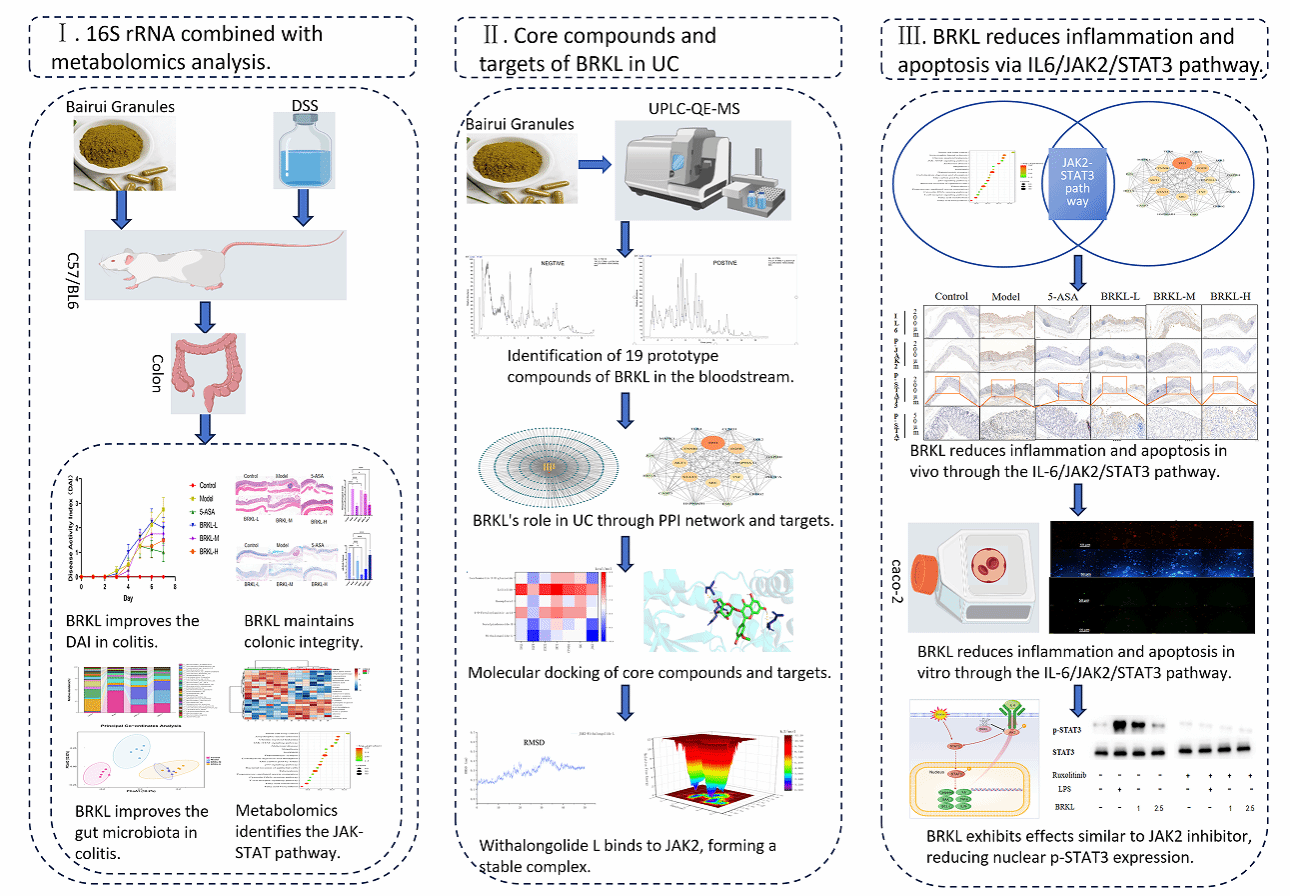 近日,我校生物医学与健康学院皖产道地中药材品质提升团队陈浩副教授及其合作团队,在百蕊颗粒治疗溃疡性结肠炎的机制研究方面取得重要突破。相关研究成果以“Bairui granules attenuate ulcerative colitis via microbial-metabolite crosstalk and Isorhamnetin-3-O-glucoside-mediated JAK2/STAT3 suppression”为题,发表于植物医学领域顶级期刊《Phytomedicine》(中科院1区top期刊,影响因子8.3)。