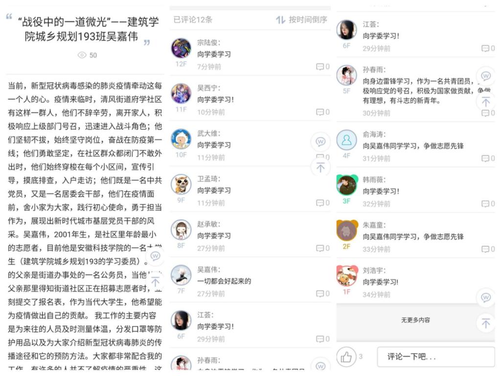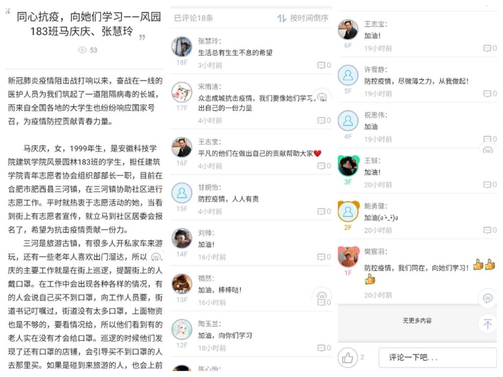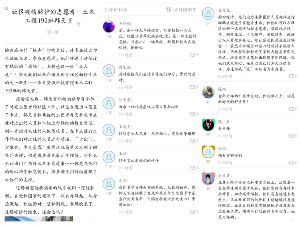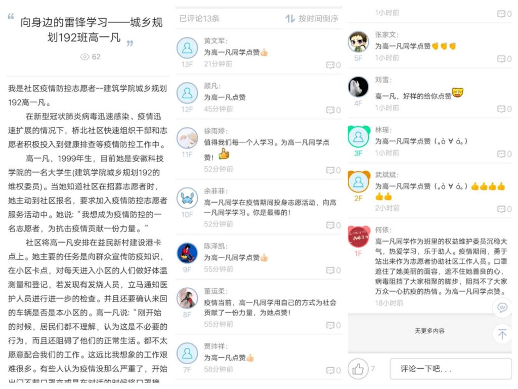 院易班工作站面向易班班长发起“学习身边的‘疫’线雷锋”号召后,各易班班长积极响应,更新各班级“疫”线雷锋数据,收集完善素材,发动班级全体学生在易班“微社区”学习身边人讲述的身边事,体悟当代青年的奉献之情、赤子之心、报国之志。