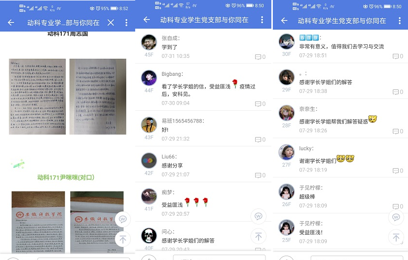 支部各党员和入党积极分子立足于本专业学习方法、志愿服务活动、学业生涯规划、专业认知学习等方面,给学弟学妹及朋辈写了一封公开信,分享交流他们的个人感悟、经验及好的做法,7月26日开始,在学院易班微社区公开展示。同时,支部党员并在评论区分享的个人感悟与经验、困扰和疑惑,积极答疑互动。