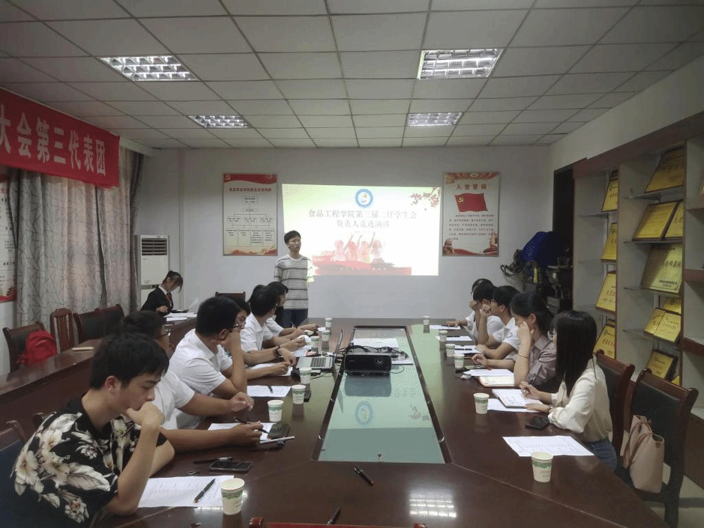 为加强学生会干部队伍建设,推进学院学生工作持续开展。9月11日,食品工程学院三届二任学生会负责人竞选活动于学院会议室开展。本次竞选的评委有专职辅导员时韩荣、吴玘,三届一任学生会各部门分管主席及部门负责人,竞选活动由学生会文艺部周心怡主持开展。