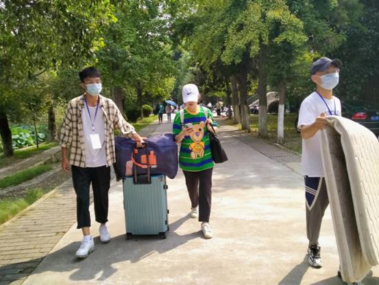 学院老师也加入迎新队伍,在报道现场帮助新生解决困难,同时亲力亲为帮新生搬运行李,与新生进行友好的交谈。