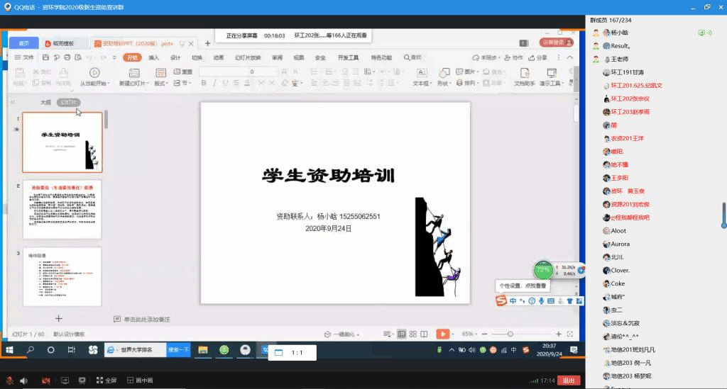 为让新生更好的了解国家和学校的资助政策,提升资助育人效果,9月24日晚,资源与环境学院在线上开展2020级新生资助宣讲会,新生辅导员王丽萍、2020级全体新生及班级助理参加此次会议,会议由资助联系人杨小晗主持。