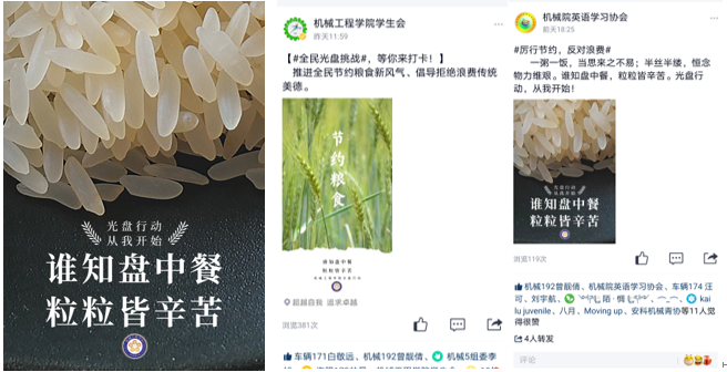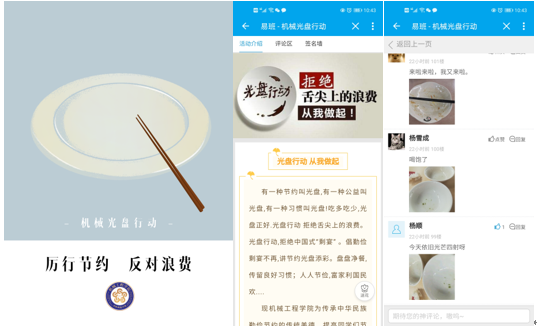 光盘行动养习惯。学院通过易班平台开展“机械工程学院光盘行动”十天打卡活动,活动开展以来,全院同学积极在评论区打卡,身体力行实践“光盘行动”,不少同学还在留言区留下了自己参加活动的收获和看法:“一粥一饭当知来之不易。”,“米粒虽小,尤见礼义廉耻,节俭事微,可助兴国安邦。”。