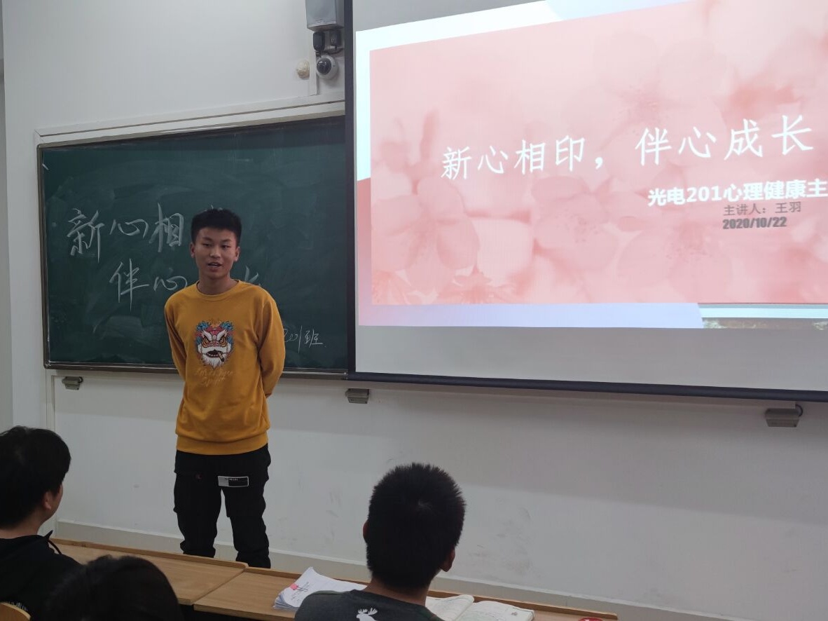 “心理健康”是指个体的心理活动处于正常状态下,即认知正常、情感协调、意志健全、个性完整和适应良好,能够充分发挥自身的最大潜能,以适应生活、学习、工作和社会环境的发展与变化的需要。班会上,心理委员介绍了本次主题班会的目的和意义。随后,通过视频、知识讲解等方式向同学们普及了心理健康标准、自我减压方法、人际交往技巧等几个方面知识点,帮助同学们快速走出大学迷茫期。最后,通过开展“破冰”活动,拉近班级同学之间距离,给大家创造一个温馨、和谐的班级氛围。会后,同学们就如何保持健康的心理素质纷纷发表了自己的看法。