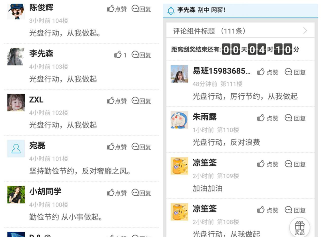 本次活动利用易班平台以线上跟帖形式展开,同学们围绕“厉行节约 反对浪费”主题进行积极留言点赞。在参与评论时,同学们可通过刮奖获取网薪和宣读“节约在于行动,大家一起做节约人”的提示语,呼吁同学们通过承诺“光盘行动,从我做起”,通过身边力所能及的小事来提高同学们的节约意识。