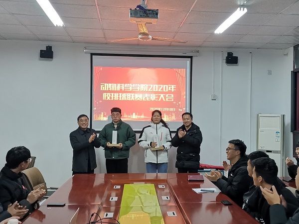 为表彰动物科学学院排球队在校第十一届排球联赛中取得的优异成绩,12月10日下午,动物科学学院在院会议室举行了2020年校排球联赛表彰大会。院党委书记姚勇、分团委书记李焱、辅导员贾方敏、胡文丽出席表彰大会。动科院排球队全体成员,学生会主席团成员及2019级、2020级各班班长参加大会。会议由李焱主持。