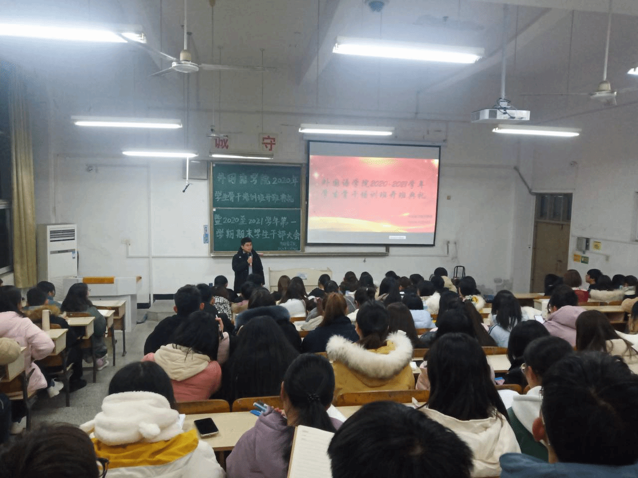 为提升学生干部综合素质,增强学生干部的服务意识,展现新一代青年“不怕苦、不畏难”的精神,进一步加强本院学生干部队伍建设,更好地展现学生干部的能力和风采,外国语学院于12月18日晚上在求知楼A座105教室举行2020年学生骨干培训班开班典礼。外国语学院党总支书记蔡为青、分团委书记陈慧中、专职辅导员宋兵兵出席此次会议。学院分团委全体成员、学生会部长级以上成员、易班工作站部长级以上成员、18-20级各班级主要班委参加。此次开班典礼由宋兵兵主持。