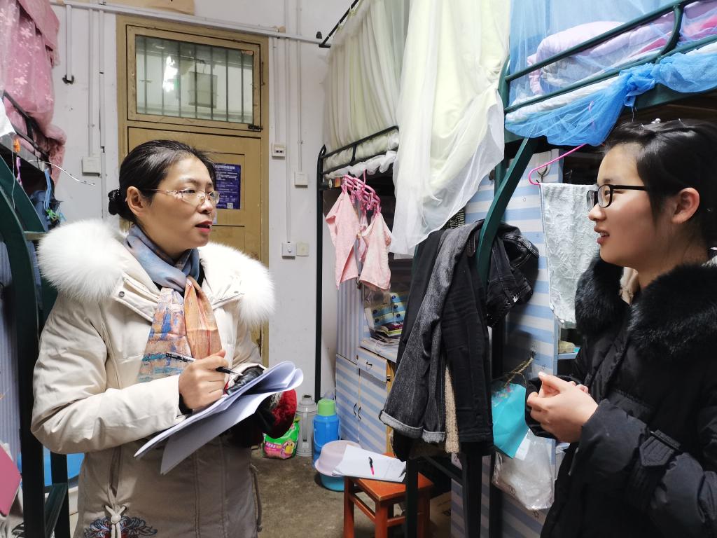 蔡为青一行走访了所有女生宿舍,亲切问询学生的学习和生活情况,她叮嘱学生要遵守学校疫情防控的相关规定和要求,合理安排好学习与生活,全力做好各项备考准备,针对考研的学生,她细心给予学生鼓励和建议,安排好住处,放松心态,平和心态备考,祝愿考研的同学要做足准备,充满信心,坚持就是胜利。对学生干部,她叮嘱要关注普通同学的心理健康安全,遇到异常情况及时报备给班主任老师。蔡为青一行到到因病外宿学生住处进行安全检查,亲切和学生及其母亲进行交谈,叮嘱要做好疫情防护,有困难找老师,给予家长和学生亲切的关怀。在走访学生宿舍过程中,领导们还叮嘱学生要做好晨午晚体温测量和登记,勤洗手、戴口罩,多通风,不串门,出现异常情况第一时间向班主任和辅导员报告。