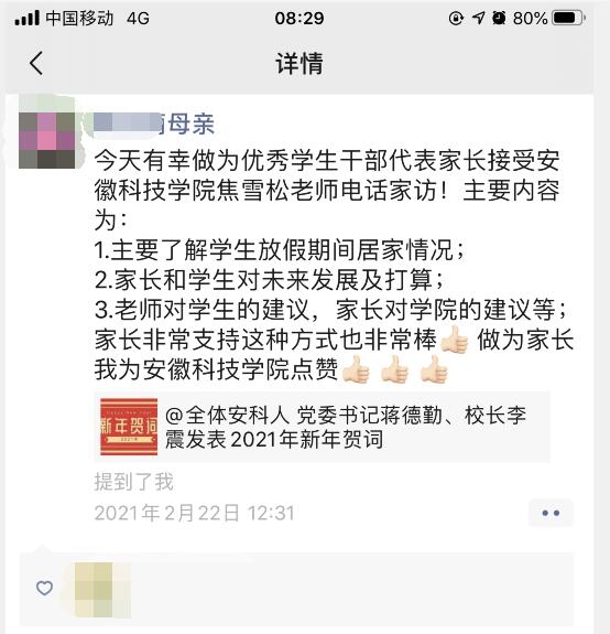 本次“云家访”活动,使学校、学院在寒假疫情期间及时了解学生的实际情况,掌握学生思想动态、实际困难与需求,传递了温暖、关怀,增进了学校与家庭、辅导员与家长的联系,增强了家校协同育人的信心,形成学校、家庭、社会的教育合力,促进学生健康成长和全面发展。同时也进一步推动了疫情防控工作,保障了广大学生寒假期间的生命健康安全。(特约通讯员:焦雪松 审核:李沙娜 编辑:李刚)
