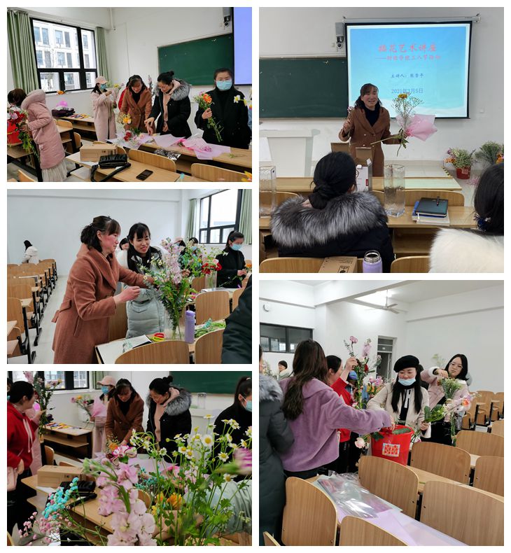 三月的校园,柳树吐绿,鲜花绽放,春意浓浓。在喜迎国际“三八”妇女节之际,为丰富女职工的文体生活,提升艺术欣赏水平、陶冶生活情操、激发工作热情,财经学院分工会于3月5日在龙湖校区致知楼C103教室举办“插花艺术沙龙”活动,邀请农学院园艺专业张雪平老师作《插花艺术》讲座,并现场教授插花技艺。