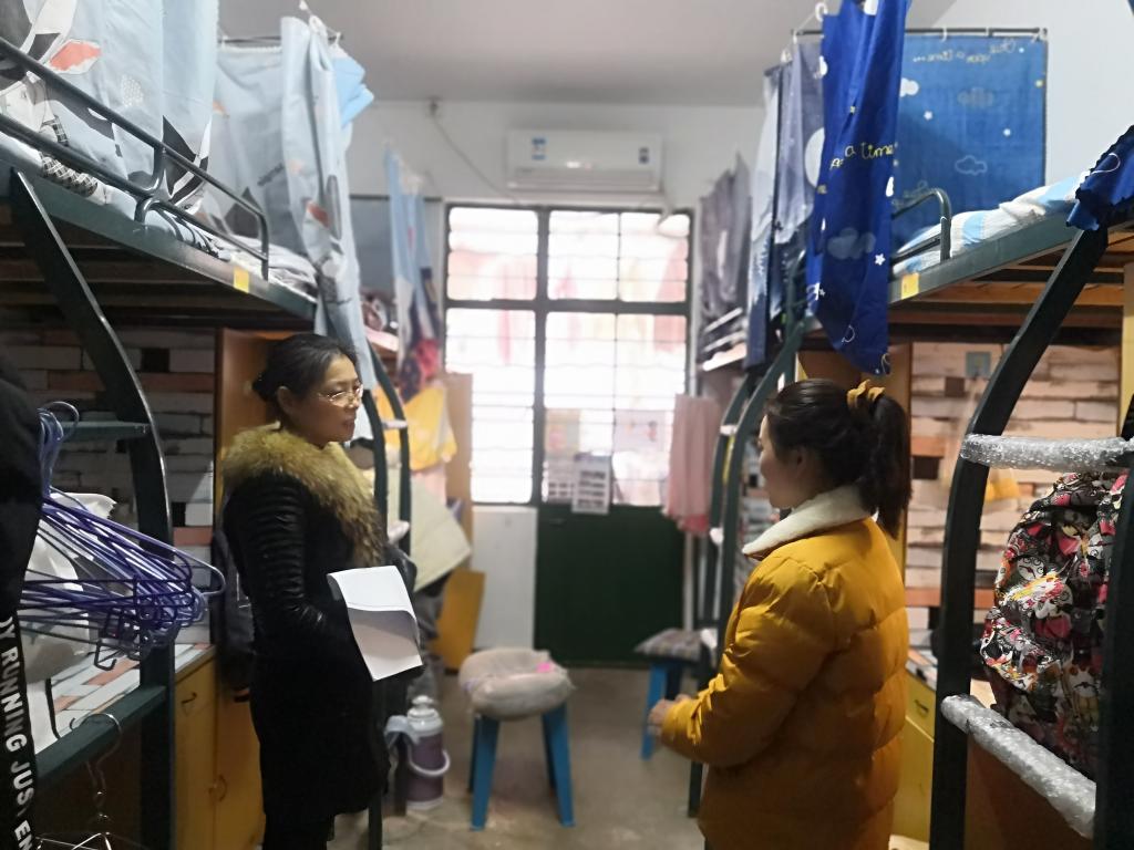 蔡为青逐一走访女生宿舍,对部分宿舍成员还未能及时返校的情况作了详细的询问,她要求宿舍长及时联系如实上报,以确保各宿舍人员的安全返校。蔡为青对于学院宿舍总体卫生、安全情况感到满意。在与同学们交谈的同时,蔡为青书记叮嘱大家要高度注意宿舍安全隐患的排查与防范,营造出一个安全温馨又上进的宿舍氛围,学生干部要起到带头作用,搞好卫生。