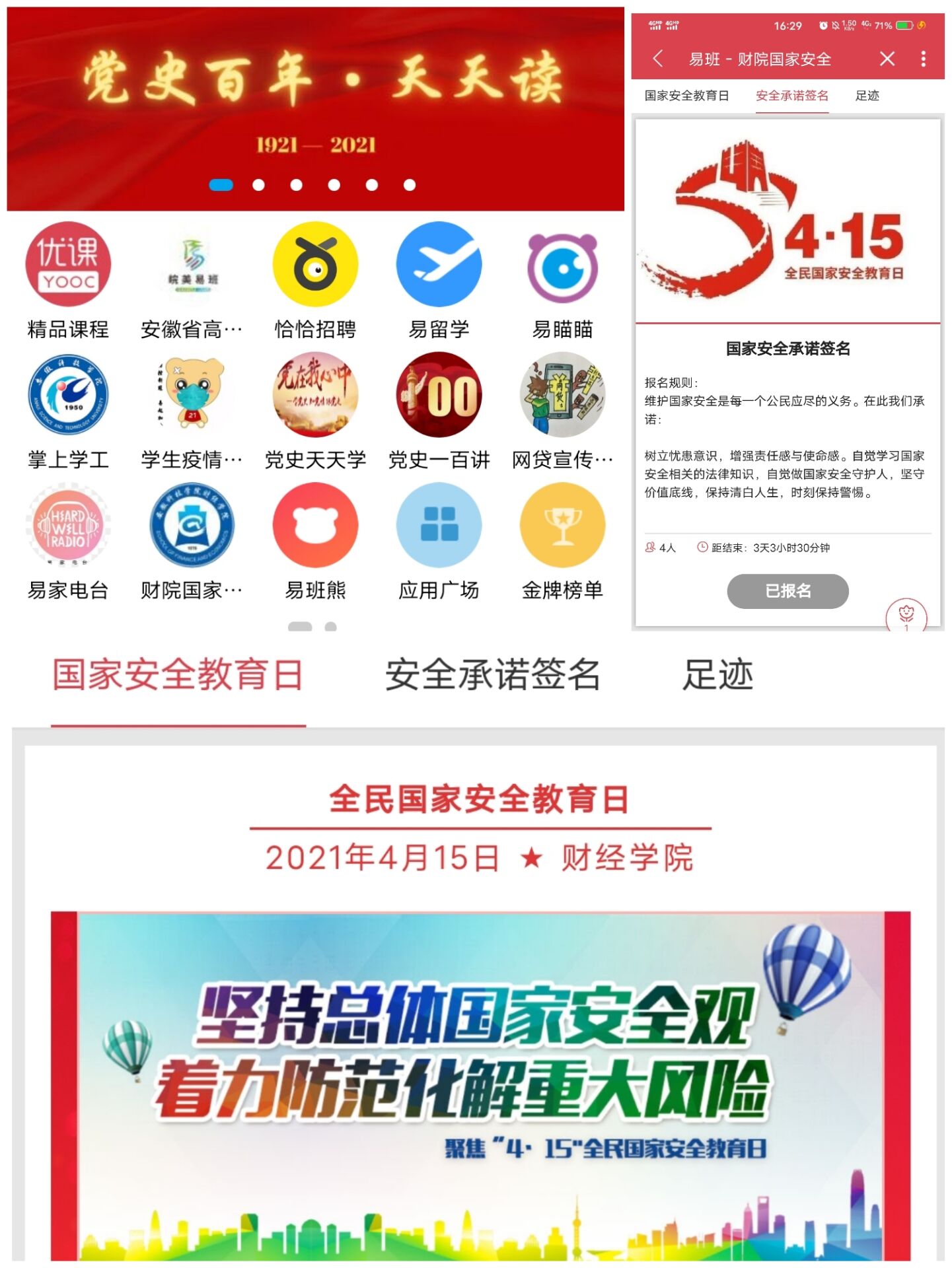 首先,学院在易班平台推出国家安全教育轻应用,吸引学生阅读主页内容,强化国家安全意识,并进行国家安全承诺签名;其次,组织学生观看“千万师生同上一堂国家安全教育课”主题公开课--《树立总体国家安全观,以实际行动维护和塑造国家安全》,以鲜活案例教育引导学生增强国家安全知识;最后,组织学生参与全国高校学生国家安全知识线上竞答,截至4月20日,全院大一学生超过半数参加知识竞答。