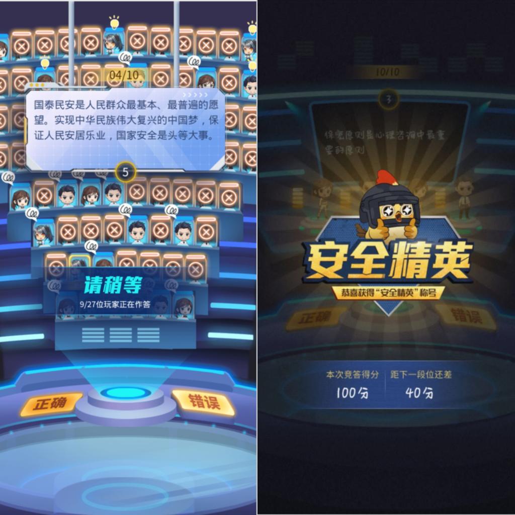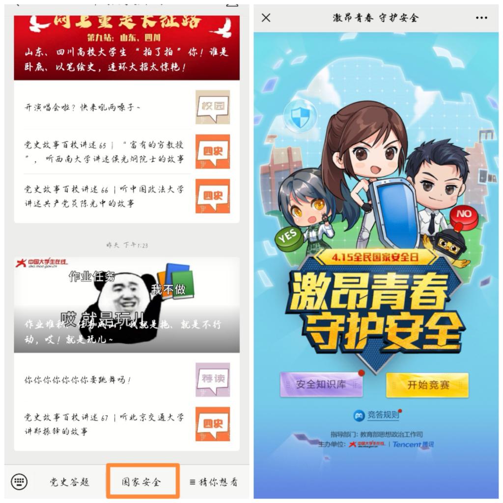 此次活动大力宣传总体国家安全观,普及《中华人民共和国国家安全法》《中华人民共和国反恐怖主义法》《中华人民共和国反间谍法》等法律法规。学生通过关注“中国大学生在线”公众号参与国家安全教育知识竞赛活动。答题共设20道,题型分为判断题和单选题,题目内容涉及总体国家安全观及政治安全、军事安全、国土安全、经济安全、文化安全等多方面。活动结束后,参与线上竞答的学生可获得中国大学生在线颁发的学习证书,获取证书后,可通过上传证书至易班课群获取PU学时。