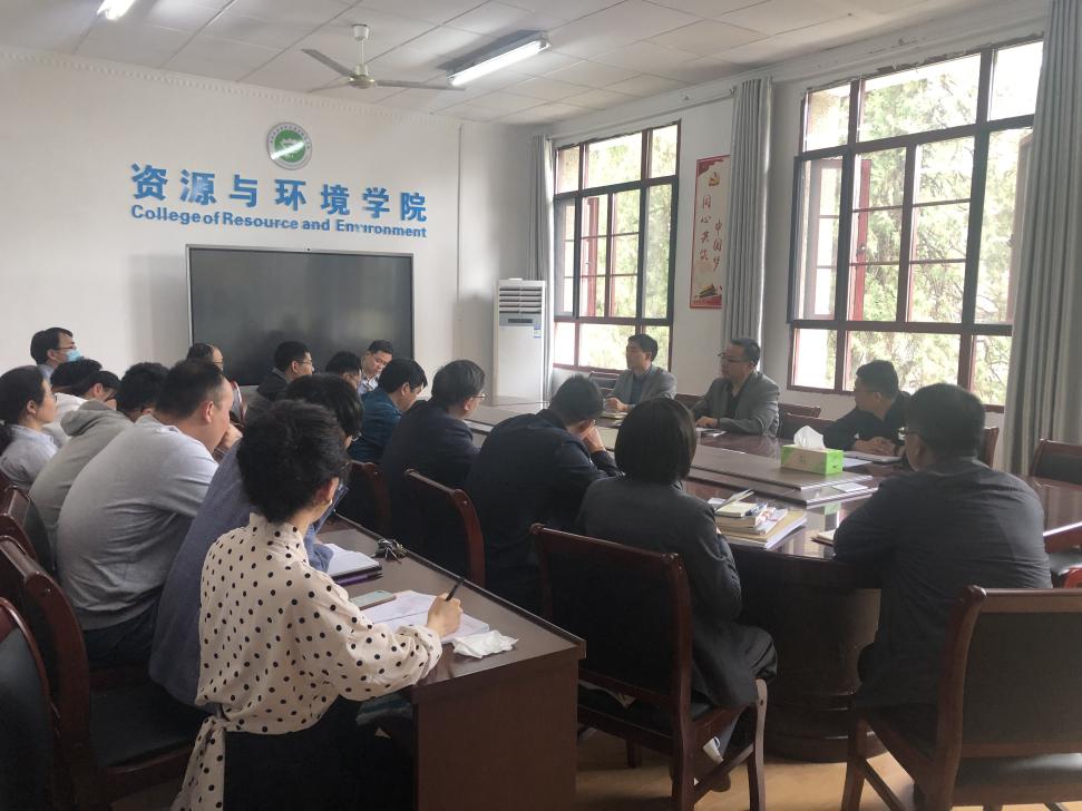 李飞跃副院长从学院人事招聘和科研工作等两大方面进行了总结与部署。第一,资源与环境学院着力快速发展,近期完成了学院新进人才的招聘相关工作;第二,强调积极申报省属公办本科院校事宜以及向学院各系分配新一年度单位目标考核工作;第三,强调2021年教职工职称评审工作相关细则,要求学院各申报教师积极准备相关申请材料;第四,就校级、省级及国家级科研项目申报工作进行了回顾与部署。