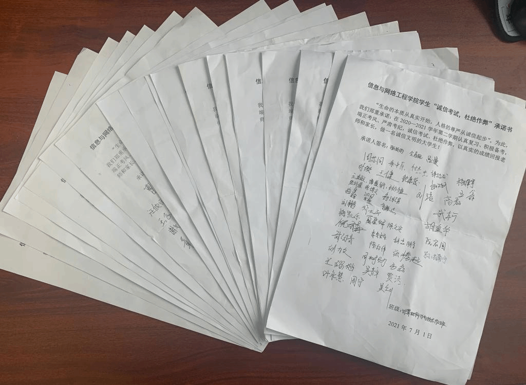 为确保将主题班会落到实处,学院专门制定《信息与网络工程学院考风考纪教育主题班会提纲》,准备了相关会议资料,要求各班辅导员按照提纲的内容和要求认真落实,精心准备。主题班会上,全体同学共同学习了《学生手册》中《半岛app官方在线入口考试工作实施细则(节选)》及《半岛app官方在线入口学生违纪处理方法》,开展了警示教育,按照《信息与网络工程学院诚信考试倡议书》的内容,发出了诚信考试倡议,希望同学们树立底线思维,积极响应学校的号召,手握诚信纸笔,书写高尚考风,坚决抵制各种舞弊行为,净化考场环境,展现自我真实水平,端正的考风、积极创造优良的学风。各班辅导员在总结时强调,诚信文明是立德成才的根本,是大学生必备的核心品质与基本修养,对大学生的未来职业发展、个人成才有着至关重要的作用。主题班会结束后,各辅导员组织全体学生签署了《信息与网络工程学院学生“诚信考试,杜绝作弊”承诺书》。