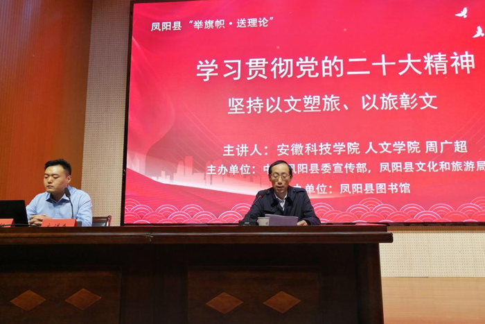 10月18日上午,人文学院教师周广超应邀参加由凤阳县委宣传部、凤阳县文化和旅游局主办的“举旗帜,送理论”活动,并作题为“学习贯彻党的二十大精神——坚持以文塑旅、以旅彰文”的讲座。县委宣传部、县文旅局、县图书馆等部分党员同志,及其它县直有关单位具体负责宣传思想文化工作的同志,约百余人到场听取了讲座。